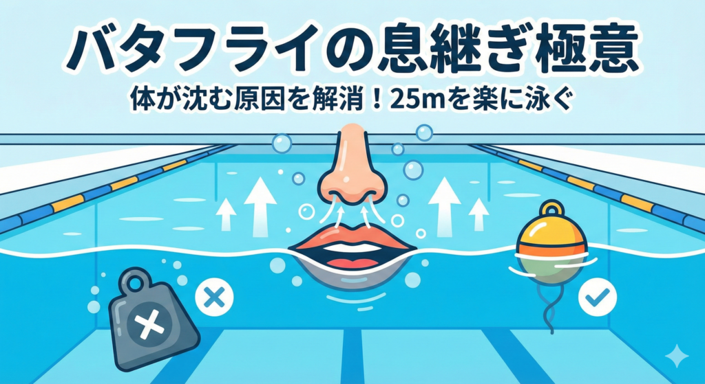 バタフライの息継ぎタイミングの極意|体が沈む原因を解消し、25mを楽に泳ぎ切る方法